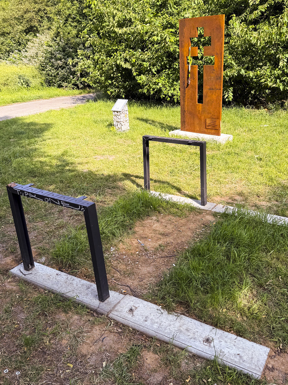Vor dem Kreuz wurde eine Ruhezone mit Bank und Tisch eingerichtet, fest auf Fundamenten im
